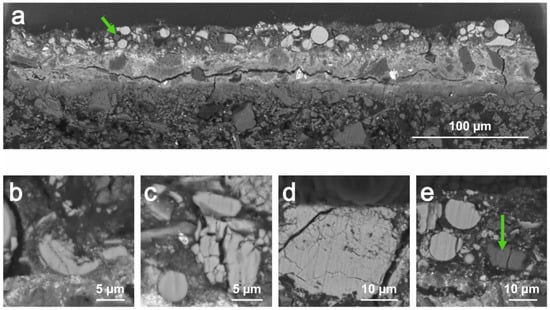 SEM-BSE images from cross-sections of sample #01 (a) and sample #02 (b–e). The green arrows highlight particles from the orange upper layer exhibiting a lower mean atomic number.