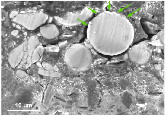 Focussing on the upper orange bright paint layer, SEM-BSE images show a large number of spherical particles with widely varying sizes ranging from, at least, 3 to 15 μm (Figure 4). Some of them are clearly crushed as a result of the grinding of the pigment (Figure 4a,b). In addition to these, particles with other shapes and also with a wide range of sizes are observed. The latter often reveal cracks of variable thickness. In a significant number of cases, the separation of the fragments resulting from the cracking seems to have occurred after the formation of the paint layer, due to the relative position that the various fragments from the same particle maintain (Figure 4b–d).