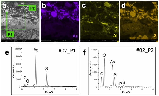 SEM back-scattered electron image of the details of sample #02 (a); SEM-EDS maps of As (b), Al (c), and S (d); and SEM-EDS spectra (e,f) of points P1 and P2 located in (a).