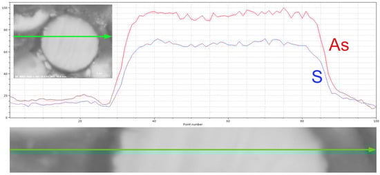 For the crystalline-flake-like material observed in Figure 5a, the molar ratio As:S is 51:49 according to the two analyses performed. In reality, the ratio is about 39:61 if we take into account the correction mentioned above, a value that, together with the lamellar structure of the particle, suggests that it is orpiment.