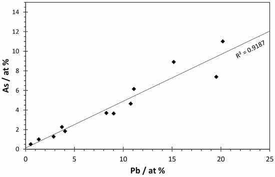 The analyses in which significant concentrations of Pb were detected correspond to points in the underlying ochre layer, mainly from areas with small particles. In these points, regardless of whether they correspond to these particles or to the matrix surrounding them, a significant correlation was found between the Pb and the As concentration (Figure 9), which suggests that the two elements are combined in the same compound, namely, a lead arsenate.