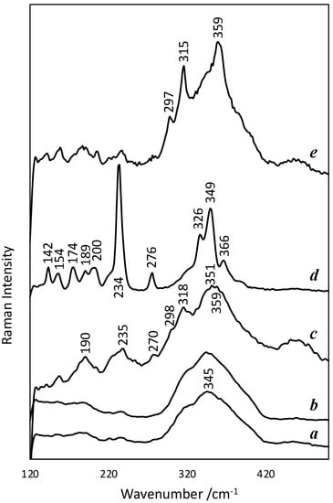 Raman spectra restricted to the 100–500 cm−1 region of the acquired extended range: (a) centre of the spherical particle, of sample #01, visible in the upper-right-hand corner of Figure 4a (analysis As6i); (b) surface ring of the same particle (analysis As6e); (c) irregularly shaped particle from sample #02 obtained by fragmentation (analysis As15); (d) particle of sample #02, visible in Figure 4d (analysis As11); (e) centre of a spherical particle of sample #02 (analysis As13i). Spectra offset for clarity.