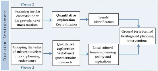 Having in mind this study as a part of a planning process for realizing the current state of insular territories in terms of: (i) mass tourism destinations and related repercussions, (ii) local cultural tourism planning endeavours undertaken so far; and (iii) current perceptions as to contemporary planning directions in implementing that kind of endeavours, the steps of the two-streams methodological approach of this work are presented in Figure 2.