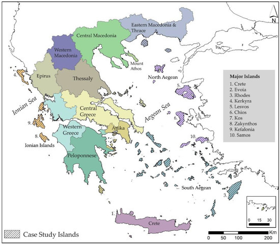 - Spilanis, I.; Kizos, T. Atlas of the Islands; University of the Aegean: Mytilene, Greece, 2015; ISBN 9789608803114. Available online: https://islands-research.aegean.gr/index.php?option=com_content&view=article&id=52&Itemid=277&lang=gr (accessed on 15 July 2022).