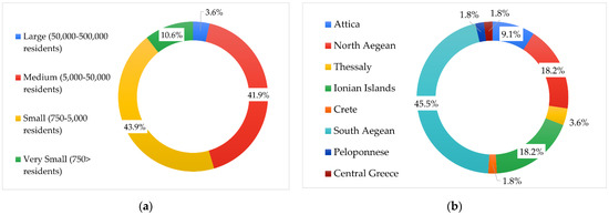 Speaking of the qualitative elaboration—second stream of work in Figure 2—this is based on data collected through an online questionnaire survey that is conducted in the time span September 2021 to March 2022. This online questionnaire research addresses all 71 Greek insular municipalities located in both the Ionian and the Aegean Sea, as above described. A high response rate is reached in this respect, engaging 55 out of the 71 insular municipalities (namely 77.5%) and covering both the Aegean and the Ionian Sea (Figure 4). The 55 insular municipalities, which have taken part in this research, represent islands that, according to their population, can be classified into small and very small (54.5%), medium (41.9%) and large ones (3.6%) (Figure 5a). Furthermore, the majority of them fall into the three, purely insular, Greek Regions, namely the Region of Southern Aegean, the Region of Northern Aegean and the Ionian Region (Figure 5b).
