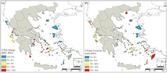 Population growth in insular territories is directly related to tourism development, which has demonstrated an accelerated pace in the past decades. This leads to a certain increase of the share of the tertiary sector in insular economies [80] and a respective increase in employment in the tourism industry. In fact, the share of employment in the tourism sector (accommodation and food services) in insular territories in the year 2011 is remarkably higher than the national average of 7.8%, reaching up to 30% in Santorini, 30.3% in Mykonos, and 35.4% in Kos (Figure 6b).