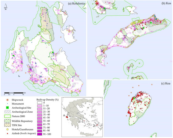 Further to the aforementioned vulnerability of tourism against external crises, seasonality and spatial distribution of the sector’s entrepreneurial activities and infrastructures result in considerable pressures upon islands’ natural, historical and cultural resources, raising thus severe sustainability concerns. As to the spatial distribution of the sector’s activities, such concerns are justified by elaboration of GHSL data, demonstrating a built-up land expansion in the period 1975–2014 that reaches an overall rate of 30%. Noticeable also is the fact that new built-up developments and major infrastructures are mainly concentrated along the coast, giving prominence to another critical issue, namely the one of coastal urban sprawl to the detriment of natural and agricultural land as well as the deterioration of coastal and marine ecosystems [83]. Figure 8 displays built-up density in a characteristic set of islands namely: (a) Kefalonia, (b) Kos, and (c) Kea. Furthermore, it displays location of: protected areas, including Natura 2000, wildlife repositories and landscapes of exceptional natural beauty [84]; land and underwater archaeological sites as well as monuments provided by the database of the Archaeological Cadastre; and tourism accommodation data (Airbnb and Hotels/Guesthouses). Mapping of these data definitely reveals the strong pressures exerted mainly on the coastal parts of insular territories that are marked as mass tourism hubs of global reach, like Kefalonia and Kos islands (Figure 8a,b respectively). However, the same holds for less known islands or “emerging destinations”, like the island of Kea (Figure 8c), displaying a rapidly growing popularity during the past decade, as witnessed by the overnight stays’ index that has, since 2011, increased by 259.1%.