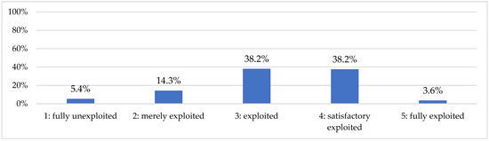 A. In this Thematic Area, municipalities’ representatives are requested to express their opinion as to the extent to which local cultural heritage (CH) assets are being exploited and integrated into the respective tourism products, forming thus an inseparable part of destination’s attractiveness. A five points Likert scale is used in this respect, representing: 1—fully unexploited CH, 2—merely exploited CH, 3—exploited CH, 4—satisfactorily exploited CH, and 5—fully exploited CH. Based on responses gathered (Figure 9), a diverse range of CH exploitation rate seems to emerge, with the majority of responses being accumulated at scale levels 3 (38.2%) and 4 (38.2%). This result witnesses that culture is perceived as a significant aspect of islands’ tourism identity and is being exploited at a satisfactory level; while its role to steer destination’s attractiveness is recognized, although not reaching its highest potential.