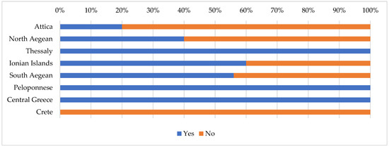 At this point, it is also worth exploring the pattern of public engagement in islands’ cultural tourism planning exercises at the regional level, where significant differences are noticed. More specifically, in the Attica Region that hosts the islands of the Argosaronic Bay—i.e., attractive tourism destinations for both foreigners and domestic visitors due to their proximity to Athens metropolitan area—public participation practices are extremely low and are implemented by only 20.0% of these islands (Figure 11). Similarly, low performance in terms of public participation is noticed in the Northern Aegean Region (40.0%). On the contrary, in the Ionian Islands and the Southern Aegean Regions inclusive planning practices are integrated into cultural tourism endeavours, although there is still enough room for improvement. In addition, the few islands that fall into the Regions of Peloponnese and Central Greece are exceptional examples of highly inclusive cultural planning approaches, as opposed to the one falling into the Region of Crete, where such approaches are completely lacking.