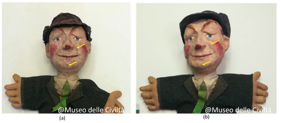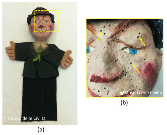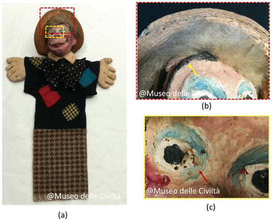 Over the centuries, puppets have been built according to different manufacturing methods using several materials. While the clothes were made of recycled fabric, eventually enriched with different accessories, the head could be made of painted wood or papier-mâché, the latter being chosen mainly for economic reasons. In this regard, the variety of materials and structures adopted for puppet’ manufacture makes the planning of restoration treatments suitable for effective preservation of this kind of artwork difficult [5,6,7]. In fact, while papier-mâché can be affected by the sorts of damage typical of cellulose-based materials, i.e., hydrolysis [8], foxing [9,10], oxidation [11] and/or attack by insects [12,13], the overlaying paint layers can present additional deterioration issues, often consisting of detachments, cracks and lacunas [14]. Moreover, papier-mâché puppets may also have undergone a series of changes over time—i.e., restorations, retouching, etc.—for stylistic adjustment and conservation purposes. Due to the above-mentioned reasons, papier-mâché artefacts can be considered as complex and multi-layer objects that require different investigation methods to identify the possible presence of damage and, consequently, to plan specifically designed repair works.