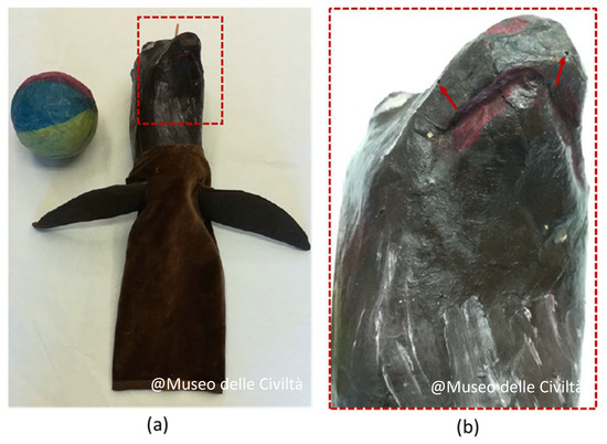The Seal with the ball (Figure 3) and the Horse (Figure 4) show similar damages. In particular, those concerning the fading of the colour and the detachment of the pictorial layer, as in the case of the horse’s eye, where it is possible to observe the preparatory layer under the surface (red arrows in Figure 4b).