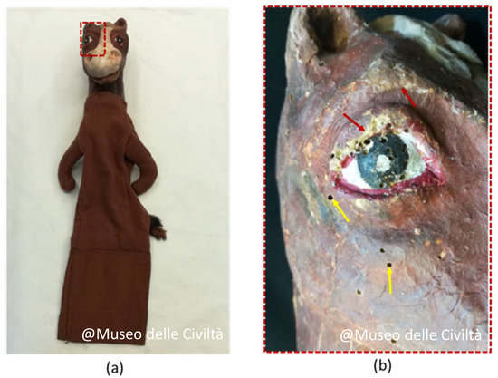 The Horse before the restoration: (a) photo; (b) magnifications of the sample areas highlighted in (a) corresponding to the horse’s eye. The yellow arrows indicate some of the exit holes due to previous entomological attacks and the red arrows the detachments of the pictorial layer. @ Museo delle Civiltà.