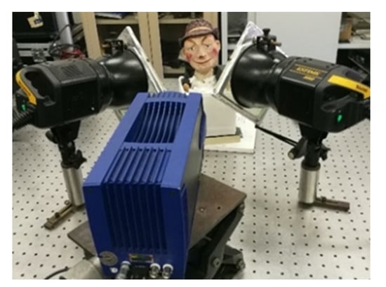 In the present study, the thermal stimulus was induced by two flash lamps (Bowens Estime 3000, maximum power 650 W) delivering 5 ms long light pulses. The lamps were positioned at a distance of 0.4 m with respect to the investigated puppet with their axes at 45° (Figure 5). Thermographic sequences were recorded by a Cedip JADE camera characterized by a noise equivalent temperature difference (NETD) < 25 mK at 30 °C (320 × 240 pixel, InSb focal plane array, 30 μm pitch, 3.6–5.1 μm wavelength range) for 1 s in full-frame mode with a frame rate of 150 Hz and, thereafter, processed by the Altair 5.50 software. To evaluate the time-dependent change in the thermographic signal for all the image pixels, the corresponding signal levels pertaining to the frame obtained just before the flash pulse were subtracted from each pixel in all the recorded thermograms. This gave the possibility of displaying the induced changes in the thermograms with a larger dynamic range [51,52].