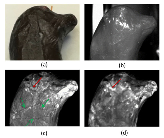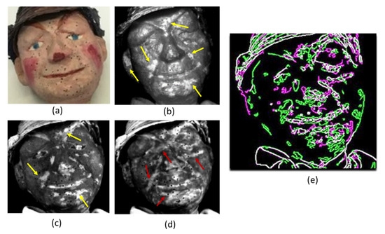 Such voids appear lighter because the subsurface voids hinder the in-depth heat diffusion, thus causing such areas to remain hotter longer than in the surrounding areas, with a consequent larger emission of IR radiation. So, the combined analysis in the MWIR region by reflectography and thermography enable one to detect features that are not so evident to the naked eye. In order to better highlight the capability of the MWIR techniques to detect features at different depths, the Sobel edge detection algorithm [53] was applied in the MATLAB2020b suite to the reflectogram (Figure 6b) and the thermogram recorded at a larger delay (Figure 6d). Figure 6e shows the obtained contours that outline the main features as detected by the two techniques with the respect to the geometry of the puppet. Such elaboration enables the pixel-by-pixel correspondence between the thermogram and the reflectogram, making it possible to highlight the different nature or location of the detected features. In particular, the purple contours correspond to the superficial features obtained from the reflectogram related to the previous restorations, while the green contours correspond to the thermogram recorded 2 s after the light pulse, and they are referred to as elements that evolve in shape and depth within the puppet’s volume. As can be seen from the figure, the presented results allow for the comparison of elements detected at different depths with different techniques without any elaboration on the images coming directly from the IR camera, ensuring the correspondence of the matrices in the algorithm elaborations [54,55]. Features similar to those observed in the Man with the tie have also been detected in the puppet called Padella (Figure 7a). The reflectogram reveals a number of restored areas that are barely visible to the naked eye, corresponding to some of the lighter areas in Figure 7b (yellow arrows in Figure 7b), which also appear in the thermogram recorded right after the perturbation (Figure 7c). Additionally, in this case the extent of the insect galleries located at a greater depth can be detected in the thermogram recorded at a larger delay (red arrows in Figure 7d).
