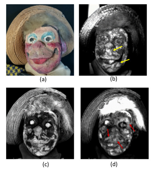 In the Man with the tie puppet (Figure 6a), the MWIR images revealed a number of details of interest. In particular, the reflectogram in Figure 6b shows the presence of lighter areas corresponding to previous restorations (yellow arrows). The lighter appearance is related to the greater IR reflectivity of the superficial paint layer employed for the restoration.