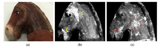 The Horse puppet before the restoration: (a) photo; (b) thermogram recorded 0.03 s after the perturbation where the yellow arrows indicate the restored areas; (c) thermogram recorded 1.5 s after the perturbation where the red arrows indicate the galleries and the red dashed circle an extended detachment.