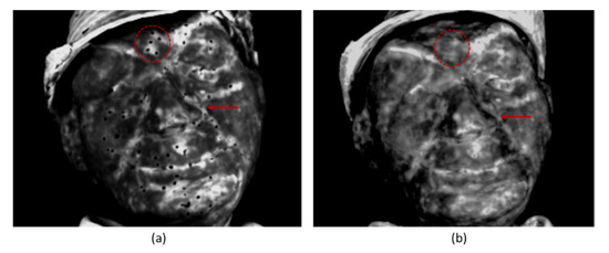 The visual examination of the puppet immediately confirmed the effectiveness of the restoration of the surface of the puppet, where the flicker holes appeared to be repaired (arrows in Figure 10a,b). Moreover, from the comparison between the thermograms before (Figure 11a) and after (Figure 11b) the restoration, further information denoting the effectiveness of the adopted procedure can be gathered. In particular, the post-restoration thermogram (Figure 11b) shows in general a smaller number of insect exit holes (circled area) and galleries (red arrows) visible with respect to the pre-restoration situation. It must nevertheless be pointed out that even in the repaired areas, some residual faint white tracks where the branched tracks existed can still be detected. This is due to the fact that the tracks were not fully filled and/or the thermal properties of the used filler may be different from those of the papier-mâché, thus producing a residual small thermal barrier effect, giving rise to the contrasting features. It is worth noting that the possibility of detecting not fully filled areas is of fundamental importance for conservators and restorers in assessing the effectiveness of the adopted treatments and planning further conservation strategies.