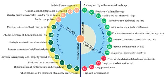 A disused pre-existing building should be reintegrated into the complex urban, social, and economic system through community involvement in an urban regeneration project [22]. In order to reach social agreement, the direct and indirect impacts must be studied in order to understand their influence, strength, and duration [23,24]. This section provides an overview, though not exhaustive, of the positive and negative externalities generated by a project of industrial heritage rehabilitation and adaptive reuse. The first part of the study involved the application of a STEEP (social, technological, economic, environmental, and political) analysis, in conjunction with a SWOT (strengths, weaknesses, opportunities, and threats) analysis, to systematize the various impacts generated by an adaptive reuse project. After the collection of the potential benefits and costs generated by transformation processes from the literature, these were first classified according to the potential for the project’s success following the SWOT methodology. The features that can be important for the project’s success are the strengths (S) and opportunities (O). In contrast, the weaknesses (W) and threats (T) are the characteristics that pose a barrier to the project’s completion. A SWOT analysis also allows elements to be classified according to their spatial location. Strengths and weaknesses are internal parts of the problem to be studied, while opportunities and threats are external aspects. In this analysis, the spatial boundary was defined as the boundary of a hypothetical area to be transformed. This working technique was combined with the STEEP analysis, in which the SWOT analysis findings were categorized into five categories: social (SO), technological (TE), economic (EC), environmental (EN), and political (PO) factors [25,26]. This combined assessment is a decision-making methodology used to better visualize the drivers of urban and territorial transformation scenarios. In this regard, the STEEP analysis enables the development of strategic plans that maximize an area’s strengths and opportunities while minimizing or resolving its weaknesses, integrating the financial aspects with purely socioeconomic and environmental criteria to obtain a global vision of the project and taking into account the entire range of the impacts generated.