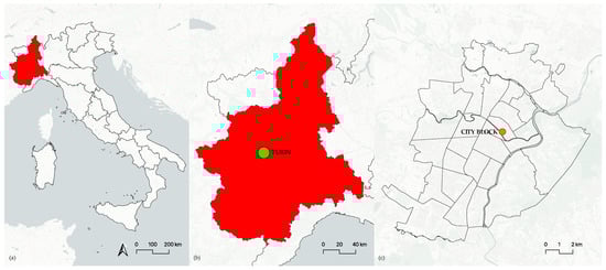 Location maps. The Piedmont Region is highlighted in red in (a), Turin is depicted in (b), and the transformed city block location is shown in (c) in relation to the municipal territory.