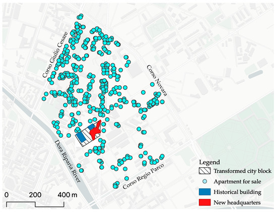 The information contained offer prices for apartments in Turin’s Aurora neighborhood. Apartments in multifamily buildings were chosen because they are the most common type of building in the area. Furthermore, the cadastral map obtained from the municipality of Turin allowed to delineate the boundaries of the subject city block and make spatial references to the properties in the sample. The distance in meters between each apartment was calculated to capture the effect of proximity on property value. Through the Geographic Information System (GIS), data on the extent and location of the buildings in terms of Euclidean distance to the redevelopment project were obtained.