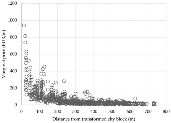 Most HPM-based research follows Rosen’s two-step process [18]. After estimating the hedonic equation, it must be differentiated in order to determine the implicit pricing of product characteristics, and after that, the demand for each attribute must be estimated as a function of price [76,77]. After estimating the coefficients, marginal prices can be calculated for each meter away from the block under consideration. Using the estimated hedonic property price equation, the implicit marginal price of the housing characteristics was calculated from the results of Model 2 according to Equation (4). The Cobb-Douglas production function made it possible to calculate the implicit price assigned by the real estate market at each distance level from the transformed plot (Figure 4). According to Table 6’s descriptive study, the average property price reduced by EUR 63.50 every increasing distance meter. Model 1’s regression results are confirmed by this estimate. Figure 4 depicts the distribution of the marginal price as a function of the distance between each observation within an 800 m radius. The graph demonstrates how the benefits decreased with distance and how the influence of externalities was most prominent within 200 m, with a large effect within 50 m.