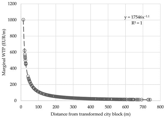 Marginal willingness to pay (WTP) for the distance from transformed city block.