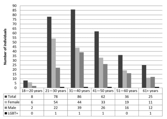 - Gender results. Three hundred participants disclosed their gender information on the survey. Most individuals identified themselves as feminine (n = 172, 57%), with the second-largest number of participants identifying themselves as male (n = 122, 41%). A smaller percentage of individuals ascribed their gender as LGBT+ (n = 6, 2%). LGBT+ participants identified themselves as queer (n = 1), male transgender (n = 2), and “Other” (n = 3).