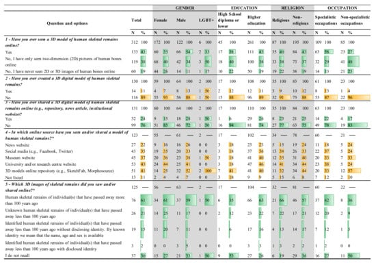 : 100% was not attributed since participants could choose more than one option; N frequency; % = percentage; SD = standard deviation; Min = minimum age; Max = maximum age. Questions 2 to 5 were only responded to by participants that have seen a 3D model of human remains (i.e., replied YES to question 1).| Group | Question | χ2 | df | p |