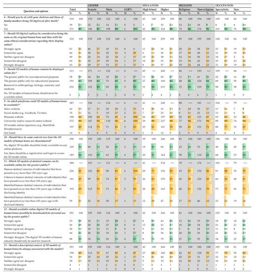 | 7—Should 3D digital replicas be considered as being the same as the original human bone and thus with the same ethical considerations regarding their display online? | ![]() | ![]() | ![]() | ![]() | ![]() | |