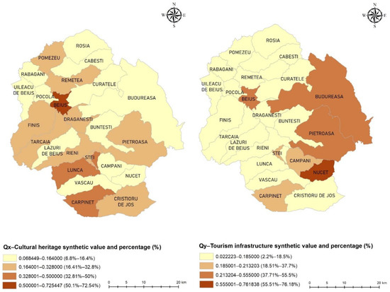 The cartographic representation of the results obtained following the application of the normalization method on the set of variables from the two analyzed phenomena, cultural heritage, and tourist infrastructure was performed at the level of the 24 territorial administrative units considered, using thematic maps or choropleth type (Figure 2). The territorial administrative units were ranked and classified into four classes, according to the normalized values (qx) and according to the synthesis value (Qx) of the two criteria considered, cultural heritage, and tourist infrastructure. The maximum potential for each object considered (territorial administrative unit) is seven, i.e., the total number of variables considered, both in the case of cultural heritage and tourist infrastructure. The maximum development potential for the two analyzed phenomena is 168; a value that once reached represents the validation of the hypothesis of a homogeneous and uniform distribution of the analyzed phenomena at the level of the entire analyzed space. Practically, each territorial administrative unit records the maximum value of each variable, which is too unlikely but plausible [27]. The utopian character of this hypothesis demonstrates the existence of an uneven spatial distribution of the analyzed phenomenon, of the presence of the differences between the obvious territorial administrative units in their classification according to the normalized values obtained.