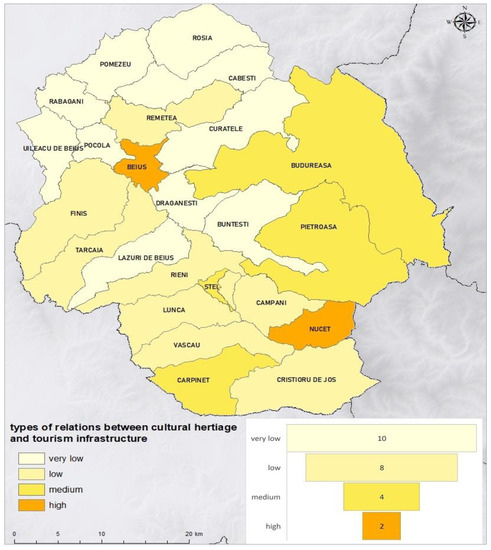 From the calculation of the arithmetic mean of the values related to the cultural potential and the one regarding the tourist infrastructure, the existence of the following categories of relations between the cultural heritage and tourism can be deduced: very strong (Beiuș, Nucet); strong (Pietroasa); weak (Remetea, Budureasa, Lunca, Ștei, Criștioru de Jos and Cărpinet), and very weak (for the rest of the territorial administrative units) (Figure 3, Table 3).