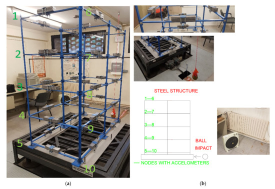 Figure 3a,b). The impact force and its corresponding momentum are homogeneous for all the tests because the ball is raised to the same height in each test. Regarding the emulation of the damage conditions of the structure, the impact procedure is performed for five different structure conditions. A first test is performed on the undamaged structure, and four additional tests are undertaken on the structure modified with different damaged configurations. As described above, for each damaged configuration, a range of different ambient temperatures is applied. Then the acceleration is monitored on some specific nodes. The test procedure consists of hitting the structure once every minute. Ten tests were applied successively for each fixed ambient temperature. During the laboratory experiments, the temperature is controlled with a thermometer. However, in order to measure the actual temperature of the structure, a thermographic image was taken by an infrared camera. The joints (