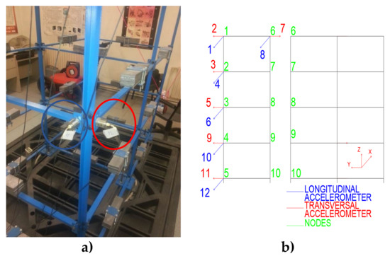 Figure 3b, the two directions of the accelerometer are detailed in each monitored node with red and blue arrows. The direction of the arrow indicates a positive direction. Accelerometers in positions 1, 4, 8, 10 and 12 were placed in the longitudinal direction (X), while in the transverse direction (Y), the accelerometers were located in positions 2, 3, 5, 7, 9 and 11 (