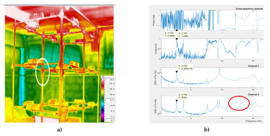 Figure 4b shows the channel 1 and 2 energy spectral density (ESD) of the test 1 (undamaged configuration) with 20.5 °C (performed 24 July 2019). In these two graphics, the peaks of the second mode (2.703 Hz) are signposted. The ESD for this mode in the first channel is 2.506·10