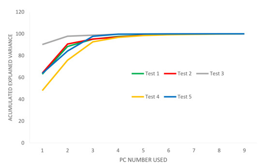 Figure 5 represents the cumulative variance explained vs. the number of principal components used for each of the damaged tests.