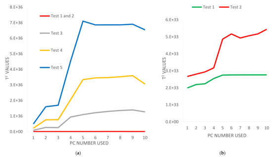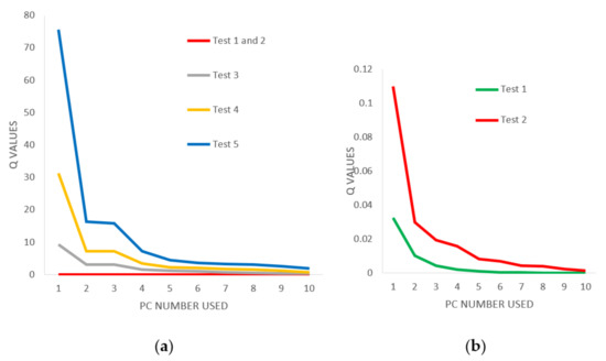 Figure 7a). However, for the tests 1 and 2 (undamaged and medium damaged structures), Q values increase monotonically since the first principal component. Therefore, in these two cases, only one principal component is needed to reach the inflexion point (