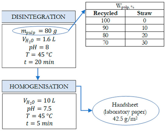 After the cooking stage of the pulping process, under the defined conditions (Table 1), the pulp was separate from the black liquor by decantation and washed with tap water. The straw pulp was moved into the Valley beater (Techlab Systems (TLS), Lezo, Spain), where it was diluted with tap water to maintain the pulp suspension at 1.5% consistency and fibrous at pH 9, 24 °C, and 500 rpm for 40 min. The thus prepared straw pulp was used as an additive to pulp from recycled fibers in different weight ratios (0:100, 10:90, 20:80, and 30:70) to form circular paper sheets with a grammage of 42.5 g/m2 and a diameter of 200 mm, using the Rapid Köthen Sheet Machine (Frank–PTI GmbH, Birkenau, Germany) required for this research. According to the general process flow of forming laboratory papers (Figure 1), nine different paper sheets with variable content of straw pulp (Table 2) and a control paper sheet (without the addition of straw pulp) were formed.