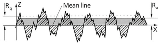 Ra is one of the most effective measures of surface roughness, as it gives a good general description of variations in surface height. The root mean square roughness (Rq) is more sensitive to occasional highs and lows and is defined as the geometric average height of roughness-component irregularities from the mean line measured within the sampling length, L. Figure 2 presents a plot of a profile where Ra and Rq levels were shown to present differences between them. L is the total length scanned on the horizontal axis, and x is the reference mean line over which the topographical heights were measured. Zx is the height amplitude at each iteration over the entire measurement length from x = 0 to L − 1. The surface profile height, Z, is calculated with reference to the mean line and plotted on the vertical axis [23,24].