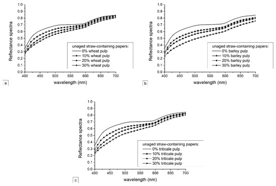 Reflectance spectra values of unaged laboratory papers containing (a) wheat pulp, (b) barley pulp, and (c) triticale pulp.
