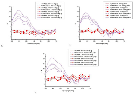 Relative reflectance changes (ΔR) of laboratory papers containing (a) wheat pulp, (b) barley pulp, and (c) triticale pulp after ageing process.
