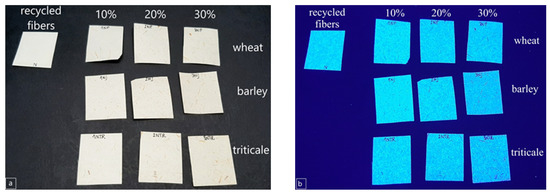 It is evident that all straw-containing papers have similar changes in the reflectance spectra due to accelerated ageing treatments in a whole spectrum. The changes caused by the dry-heat ageing method are minor in the whole spectrum, while ageing with a UV radiation caused significant changes of papers reflectance in the area of shorter wavelengths (blue part). This trend was expected since light, the more energy-rich component (near UV radiation), causes the gradual degradation of paper and other organic based materials [28]. This coincides with the fact that most of the damage to cellulose during the exposure to electromagnetic radiation is induced in that spectral range [25]. In addition, this result may indicate the presence of chemical substances used to enhance the brightness and whiteness of the paper produced from recycled fibers. Optical brightening agents (OBA) absorb light in the ultraviolet spectrum (between 330 and 390 nm) and re-emit the light in the visible blue region (between 400 and 480 nm) [29]. The fastest way to prove the presence of OBA in paper is to observe the sample under the UV light [30]. From the visual evaluation results under illuminant D50 presented in Figure 5a, it is evident that the prepared straw-containing laboratory papers do not differ in color. However, when UV light is incident on the paper surface, it causes excitation of fluorescence in the blue region of the visible light spectrum on laboratory paper samples (Figure 5b), whereas the non-OBA-containing paper would appear very dark [30]. Thus, the presence of optical brighteners in the recycled pulp can be seen in Figure 5b. In addition, with an increase in the content of straw pulp in laboratory paper samples, the influence of optical brightness is lower (Figure 4a–c).