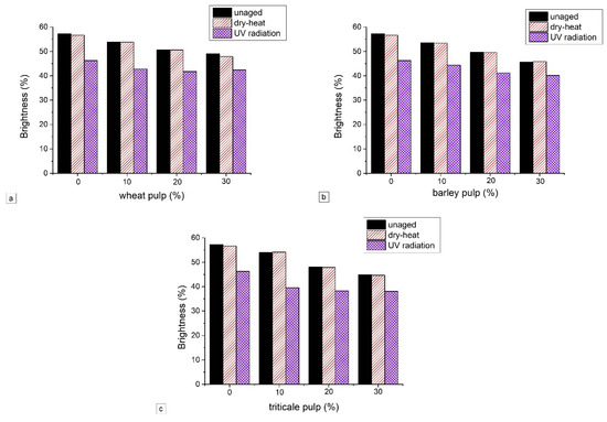 CIE brightness values for unaged straw-containing papers were as follows: control paper = 57.24%; paper with 10% wheat pulp = 53.91%; paper with 20% wheat pulp = 50.58%; paper with 30% wheat pulp = 49.00%; paper with 10% barley pulp = 53.55%; paper with 20% barley pulp = 49.64%; paper with 30% barley pulp = 45.59%; paper with 10% triticale pulp = 53.98%; paper with 20% triticale pulp = 48.04%; and paper with 30% triticale pulp = 44.82% (Figure 6a–c). Generally, the CIE brightness value of all laboratory-made papers was low. This is a consequence of its composition, as recycled fibers were the main component in all laboratory papers.