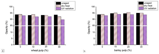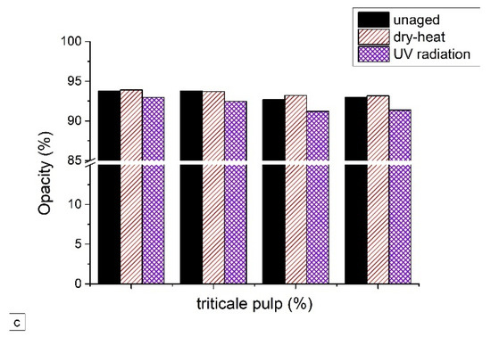 After dry-heat treatment, the opacity of barley or triticale straw-containing laboratory papers increased (Figure 7b,c), while, in the case of wheat-straw-containing paper, a decrease in opacity was observed for papers with 20% and 30% straw share. In the case of UV radiation treatment, a slight decrease in opacity occurs in almost all paper samples, but it is generally higher in laboratory papers with a higher content of straw pulp.