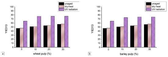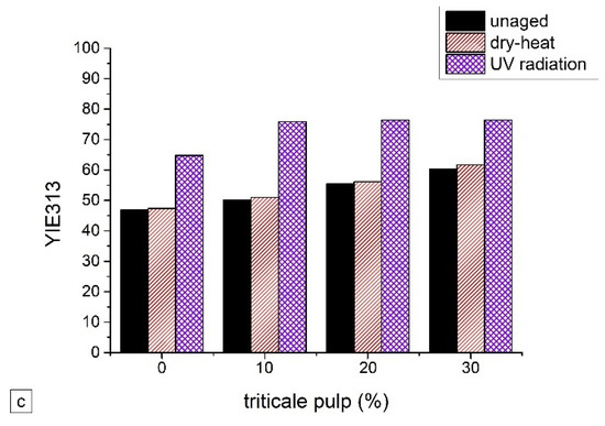 The yellowness index increases (Figure 8a–c) after accelerated ageing, and these changes are correlated with a decrease in brightness. The yellowness index is a number calculated from spectrophotometric data that describes the change in color of a test sample from clear to yellow.