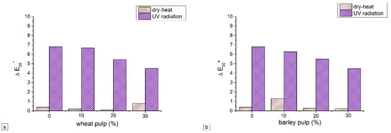 As it is visible from the measurement results of unaged straw-containing papers, the brightness values of the laboratory-formed papers are decreased in dependence on the content of straw pulp. The decrease in brightness compared to the control paper (consisting only of recycled pulp) is due to the addition of unbleached straw pulp. Therefore, papers with 30% of straw pulp have the lowest brightness. In addition, the brightness of the papers containing straw pulp is sensitive to the presence of lignin in the paper. Namely, lignin gives paper a yellow–brown color, which absorbs blue light and thus reduces the brightness of such paper. Of all observed straws, wheat pulp produces papers with the highest brightness value. It is known that paper, as a material made from natural fibrous raw materials, decays mainly under the influence of light. Namely, cellulose fibers tend to undergo yellowing (brightness reversion) when exposed to sunlight. It is generally accepted that this coloration occurs due to residual lignin constituent in the pulp. As published in a previous study [13], the presence of residual lignin in the pulp of wheat, barley, and triticale straw used in laboratory paper production for this study is evident through the Kappa number, which was 30.0, 29.6, and 32.4, respectively. It has been reported that pure cellulose and white paper have higher stability and resistance to the combined effects of heat and light in comparison with recycled paper [28]. The results obtained from this research have confirmed that UV radiation has a greater influence on the optical properties of paper than temperature. A slight decrease in brightness of no more than 2% was observed for all samples after dry-heat treatment. The brightness reduction is more significant for the samples treated with UV radiation, where the change is up to 25% (Figure 6). The loss of brightness (paper yellowing) during the ageing procedure is attributed to the presence of the chromophores formed by the decomposition of the main lignocellulosic components of paper (cellulose, hemicellulose, and lignin).
