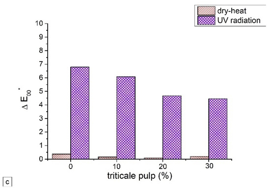 As expected, papers under the influence of UV radiation show a far greater change in color than after ageing at an elevated temperature. According to the tolerance definition, ΔE00* ≤ 2 is classified as a very small noticeable difference for a standard observer, while ΔE00* ≥ 5 is defined as a big noticeable difference in the color that a standard observer can recognize [35]. Changes in the color of laboratory-formed papers after thermal ageing are not noticeable to a standard observer (ΔE00* < 1.4). Interestingly, far greater color changes were observed in the control paper, which does not contain straw pulp of any crop (ΔE00* reaches up to 7), while with the addition of wheat, barley, or triticale pulp, the total color difference decreases with ageing and is least pronounced in papers containing 30% of straw pulp (Figure 9). The calculated ΔE00* values show the same trend as the exanimated brightness values.