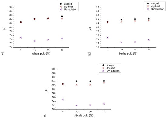 Influence of accelerated ageing on pH value of laboratory papers containing (a) wheat pulp, (b) barley pulp, and (c) triticale pulp.