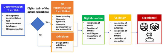 The results of the digitization undertake several steps, including the synthesis of different scans to implement the synthetic model of the exhibition, and the optimization of the 3D model so that it is appropriate for real-time rendering on the Web and in VR. In the second case, the design of the digital exhibition is performed online by facilitating the exhibition designer of the Invisible Museum platform. The outcomes of both variations of the methodology are the shell of the exhibition in a digital form as a 3D model.