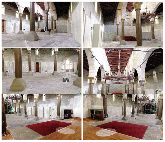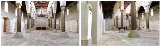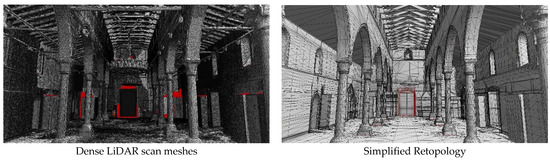 For the implementation of the 3D model of the Basilica, the eighteen LiDAR Faro scans that were acquired were used. These scans can capture accurate distances with the quality geometric representation of the real shapes and colors of the structures, although blind spots remain, which are areas that have obstacles during the scanning process that do not overlap, meaning that even the densest point-cloud mesh suffers from empty patches of geometry. Small geometric artifacts that arise from each scan multiply as they automatically merge by the underlying point-cloud technology, introducing errors in both the accuracy and aesthetic appearance. Not merging the overlapping geometries of the individual scanned meshes makes for an unpleasant appearance, and the models are often unusable, other than a reference point, as even the best systems cannot drive the geometry for real-time VR applications. Polygon decimation is very limited, and it introduces extra issues, such as polygonal invisibility, duplication, and overlapping, and it usually expands any blank areas. Correcting these errors is a tedious process (see