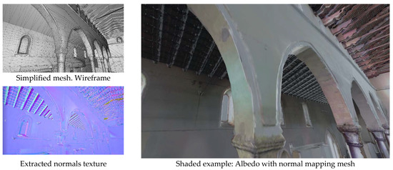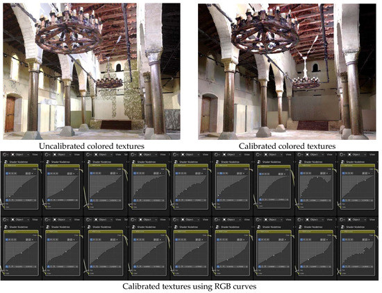47] was used for modeling and retexturing the final structure. A total of eighteen scans were registered, consisting of 325,000 polygons and 4K textures each (6.8 million triangles and 352.3 megapixel textures). The retopology process involves projecting individual multiple faces and edges onto the dense LiDAR polygonal structure to create an approximate structural mesh with an 8K texture (67.1 megapixels). For uniform texture unwrapping, SmartUV at 30 degrees with a 0.00006 island margin is appropriate for 8K texturing, and any overlapping UVs can easily be corrected. For the texture extraction, the bake output margin is set to 3 px to minimize the color bleeding while compensating for any acute-angled triangles in the UVs, and the ray distance is set at 4 cm for albedo, and 2 cm for normal. All the individual scan extractions have alpha transparency, which indicates the overlapping geometries between the retopology mesh and LiDAR mesh, and that is used to mask the overlapping textures. Extra artistic-driven masks are used to soften the various textures in one unified synthesis, which is a process that is also used for normal mapping. The final-texture composite can achieve the impression of a higher-fidelity mesh in one simplified mesh. The scans are taken at different times of the day, creating uneven lit surfaces, with major differences in the white balance (temperature), and to compensate, the best-lit scan is used as a guide for the color calibration for the others using RGB curves. To fill the blank surfaces, the boundary edges are extracted in a secondary mesh, which is artistically filled as appropriate. New UVs are created and downscaled to be equivalent or smaller to the target mesh, and they are merged in the empty UV areas. Cloning is used to make up for the reimagined parts in both albedo and normal mapping. The final calibrated colored textures are presented in